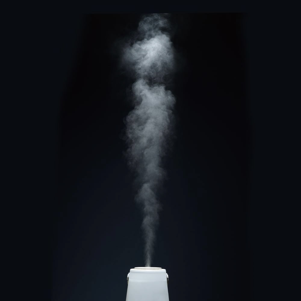 大容量ハイブリット式加湿器。ダブルファン搭載でミストを強力に拡散。ミストが炎のように見えるLEDライト搭載。