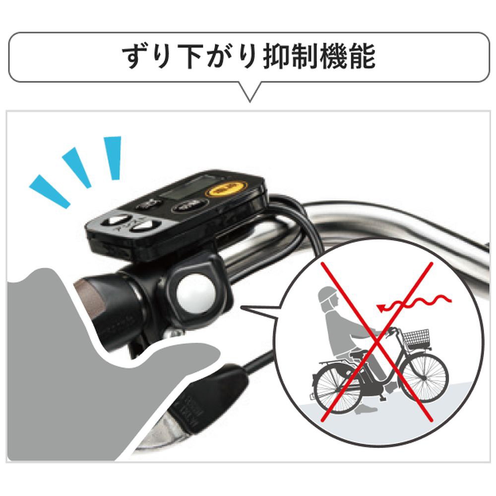 上り坂で押し歩き中に押し歩きボタンから指が離れても、ずり下がり抑制機能が起動し、約10秒間、自転車が勢いよくずり下がることを抑制します。