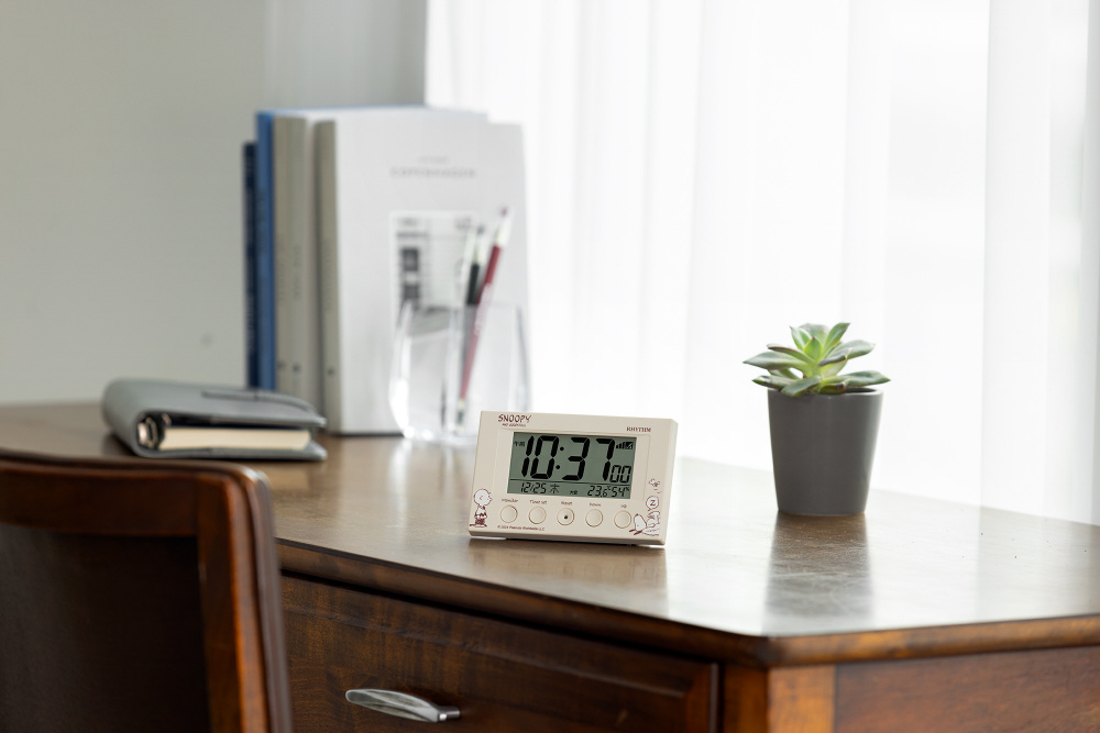 スヌーピーのイラストがかわいい、くらしになじみやすいデザインの、スヌーピーの電波デジタルめざまし時計