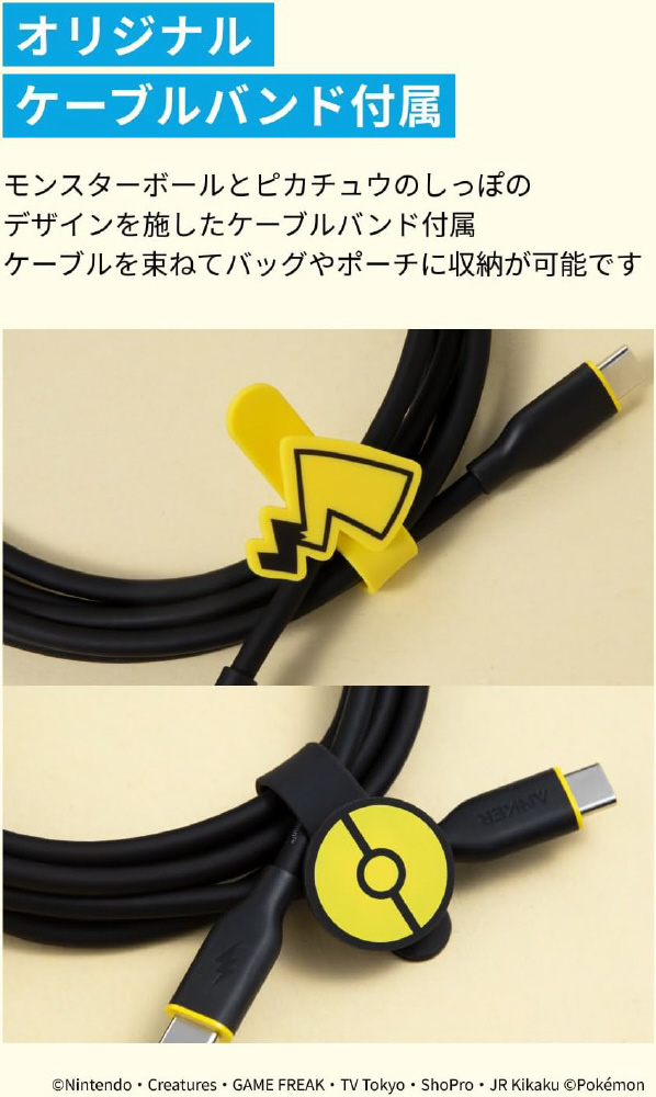 モンスターボールとピカチュウのしっぽのデザインを施したケーブルバンド付属。ケーブルを束ねてバッグやポーチに収納が可能です。