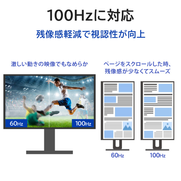 また、100Hz対応なので、一般的な60Hzディスプレイよりも残像感が抑制され、視認性が向上します。