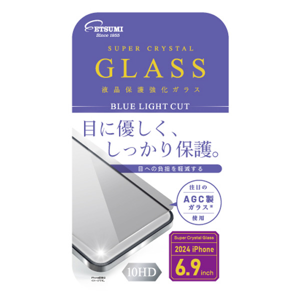 iPhone 16 Pro Max対応の液晶保護超強化ガラス。目への負担を軽減し、自然な色に見えるよう、ブルーライトカット率を40%に設計。薄さ0.33mmで、しっかりと画面を保護する高硬度10HDのAGC製ガラスを使用。