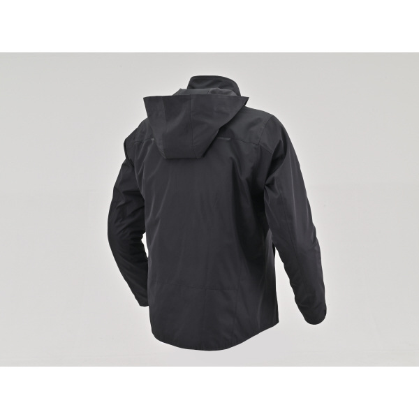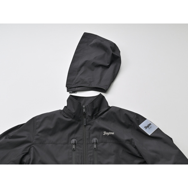 フードはファスナーで取り外し可能で、背面には夜間の視認性を高める反射プリント付き。