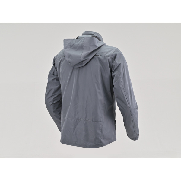 フードはファスナーで取り外し可能で、背面には夜間の視認性を高める反射プリント付き。