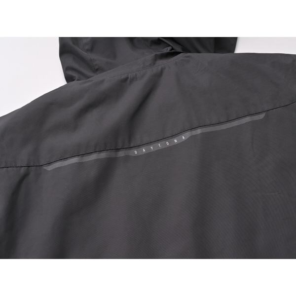 フードはファスナーで取り外し可能で、背面には夜間の視認性を高める反射プリント付き。