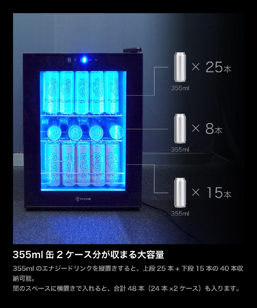 355mlのエナジードリンクを縦置きすると、上段25本+下段15本の40本収納可能。