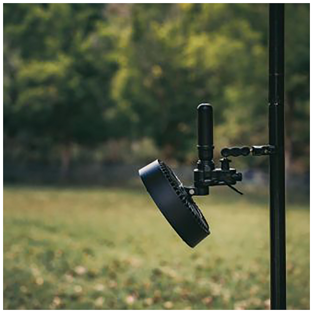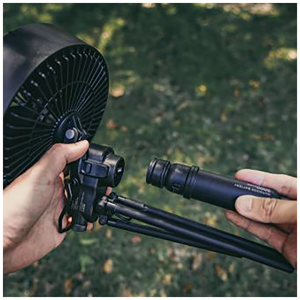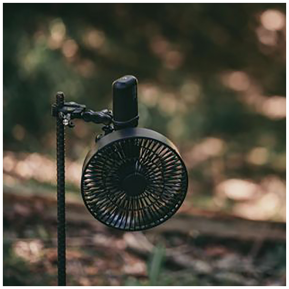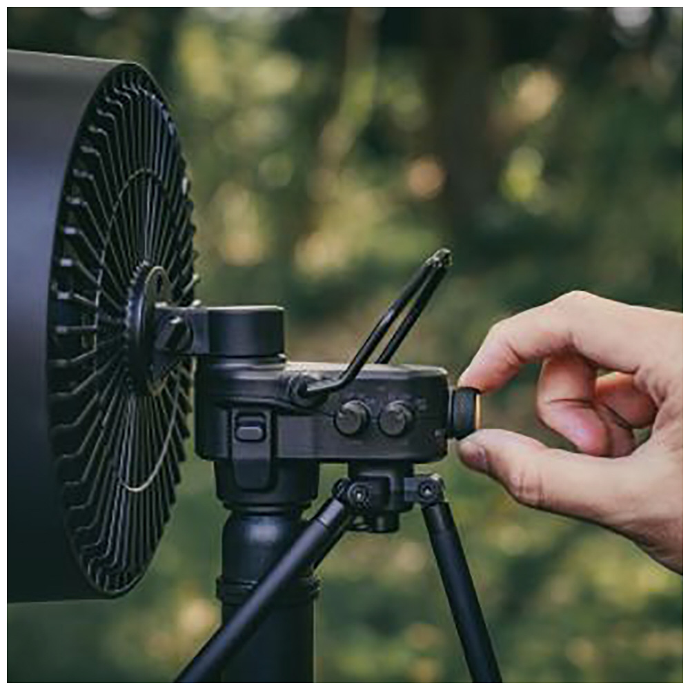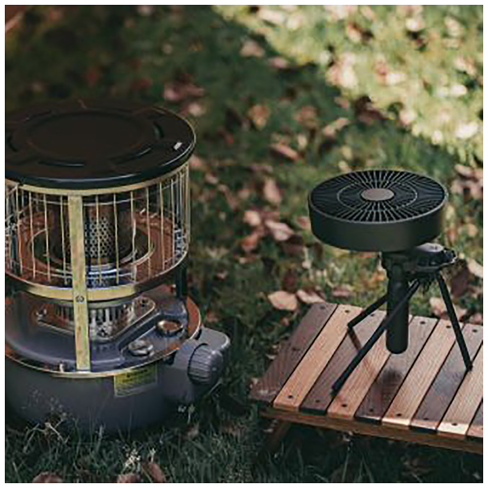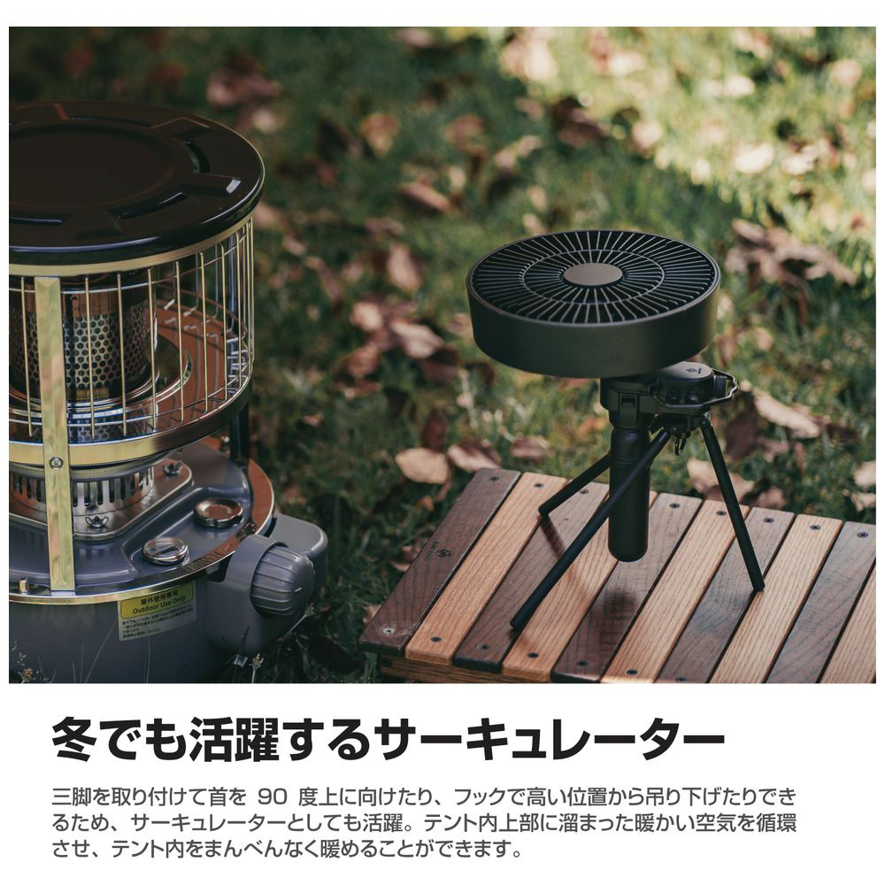 ■三脚を取り付けて首を90度上に向けたり、フックで高い位置から吊り下げたりできるため、サーキュレーターとしても活躍。テント内上部に溜まった暖かい空気を循環させ、テント内をまんべんなく暖めることができます。