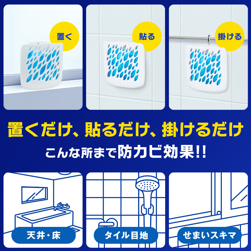 カビキラー史上最先端防カビ技術で奥深くまで防カビ※。防カビ効果の高いカラシナの種子から抽出したエッセンシャルオイルを選定。防カビ成分が24時間常に空気中に補充されるため、6週間しっかり効果が持続。置くだけ・貼るだけの簡単な使用方法(※タイル目地等の小さい穴(細孔)や狭い隙間に防カビ成分が入り込む)。