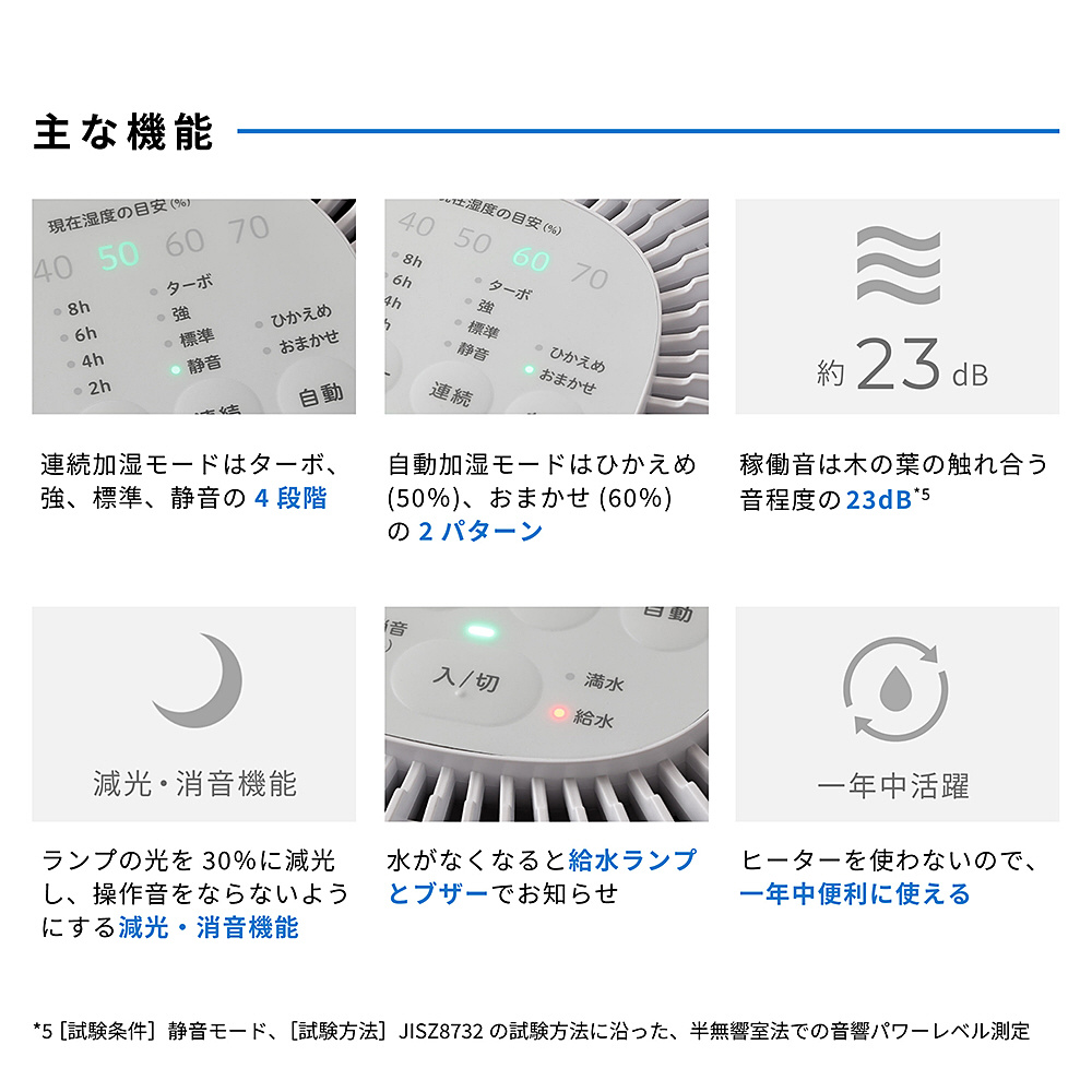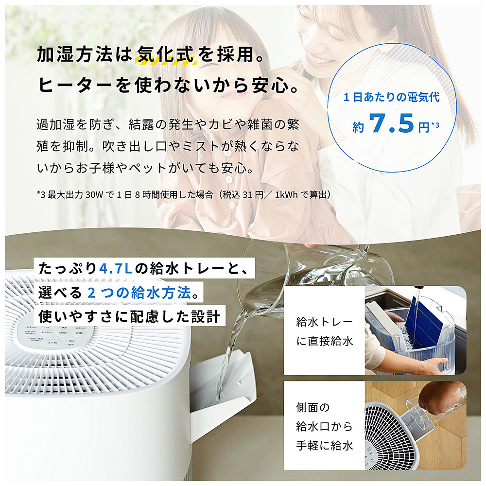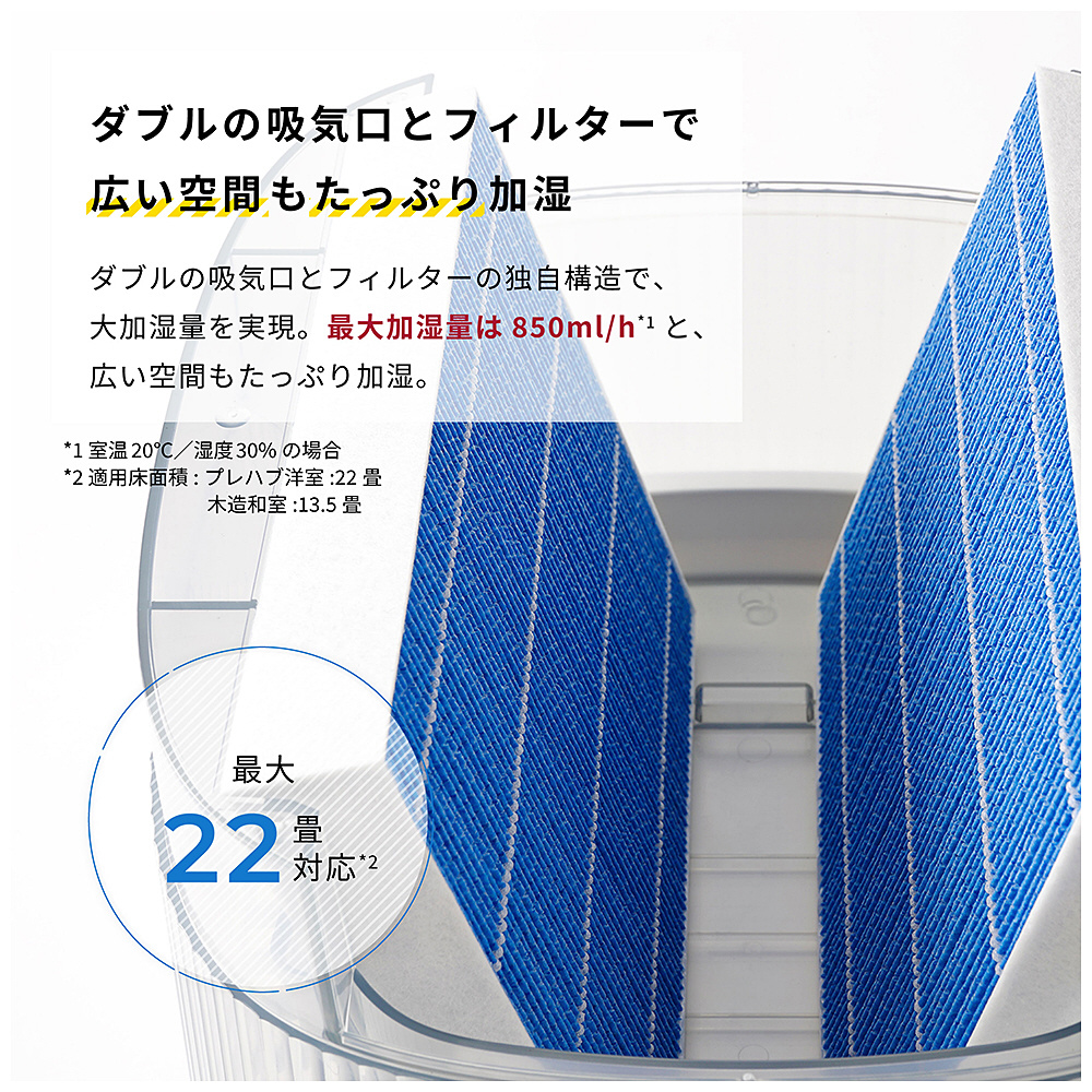 1. ダブルの吸気口とフィルターで広い空間でもしっかり加湿