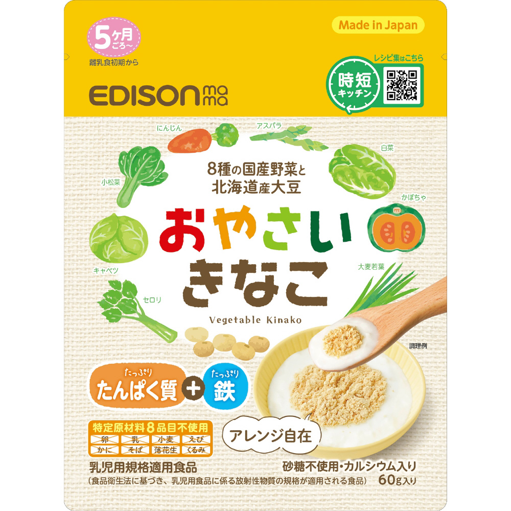お子様に人気のきなこ。きなこに8種類(かぼちゃ・にんじん・小松菜・白菜・キャベツ・アスパラガス・大麦若葉・セロリ)の国産野菜を配合。