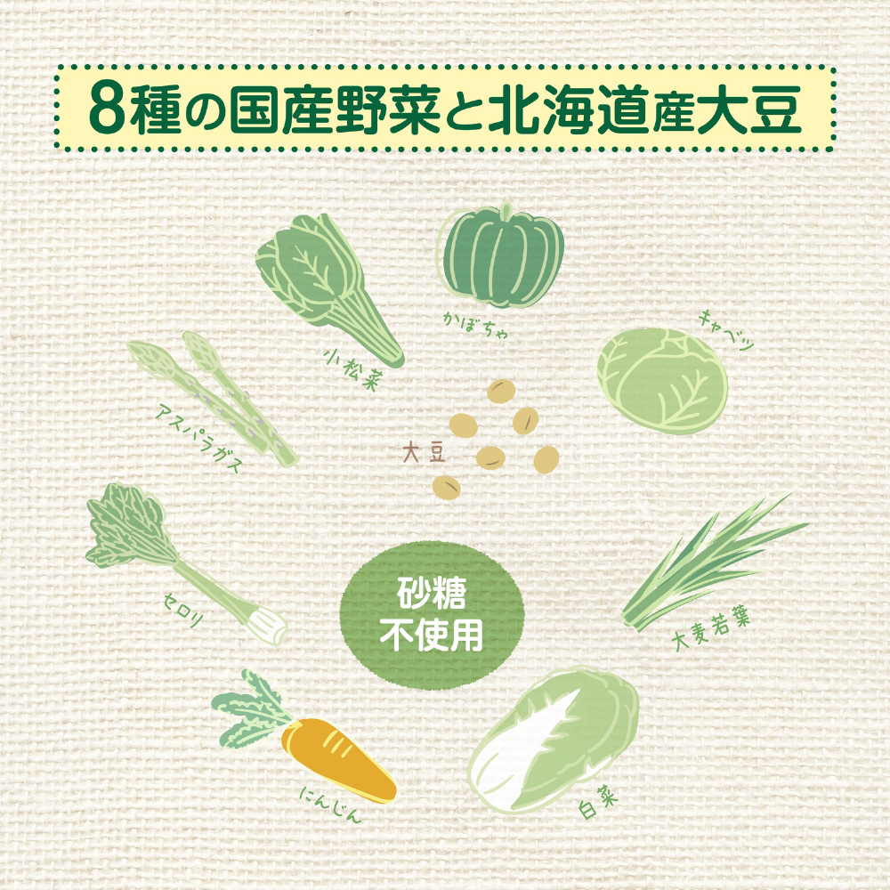 原材料名 大豆(北海道産)「遺伝子組み換えでない」、かぼちゃ粉末、にんじん粉末、小松菜粉末、白菜粉末、キャベツ粉末、アスパラガス粉末、大麦若葉粉末、セロリ粉末