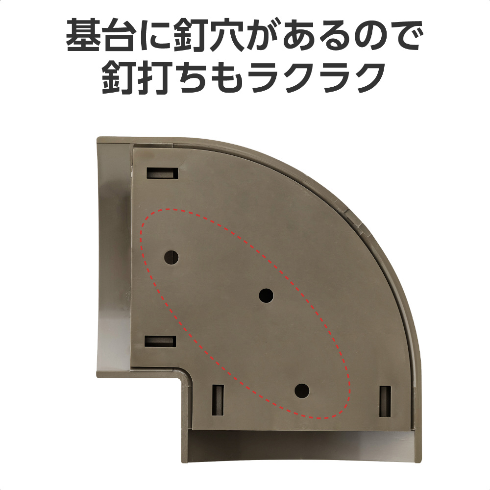 基台付きで、カバーはワゴンモールの蓋の上からかぶせるだけ。床配線の際のケーブルを保護し、すっきりと収納できる床用モール(LD-GA1507MBR)用のジョイントパーツ(曲ガリ)。