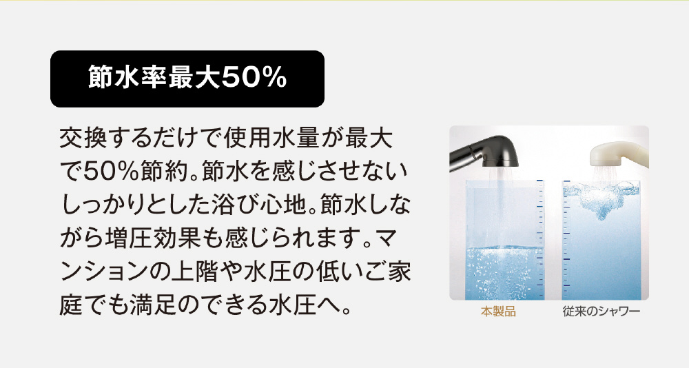 節水率最大50%で節水しながら増圧効果。
