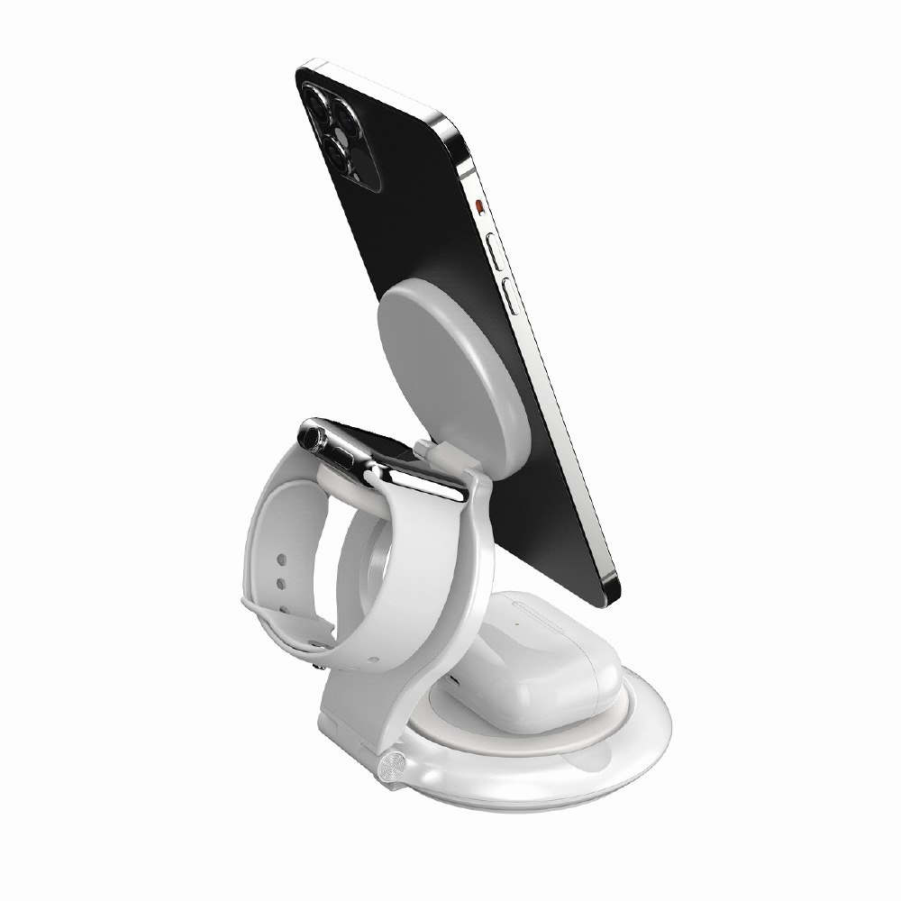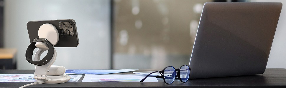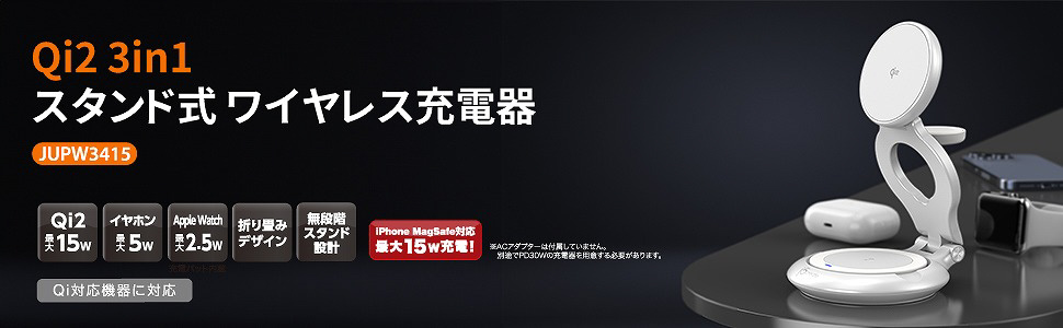 本製品は最先端のQi2テクノロジーを採用しており、MagSafe搭載のiPhoneに最大15Wのワイヤレス充電を提供します。3in1の設計で、スマートフォンだけでなく、スマートウォッチやイヤホンも同時に充電可能です。