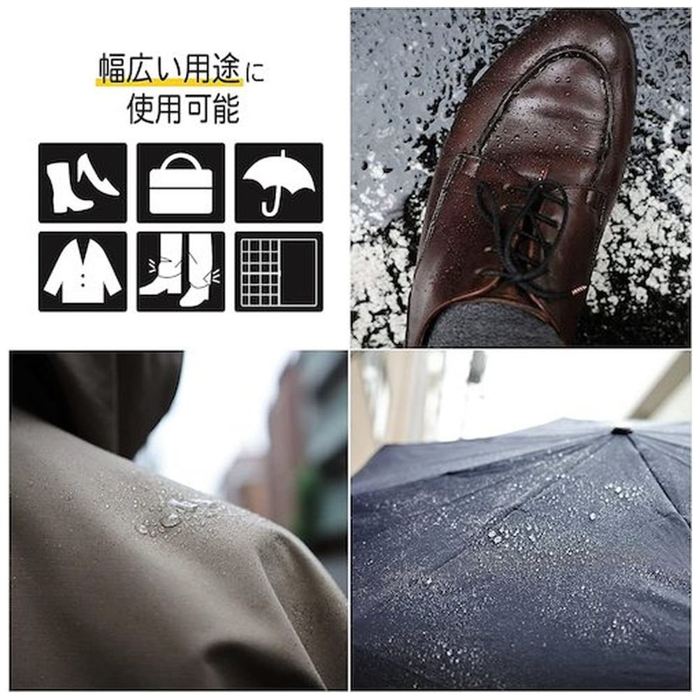 フッ素樹脂配合の防水スプレーで、靴やバッグ、傘、衣服など幅広いアイテムに使用できます。