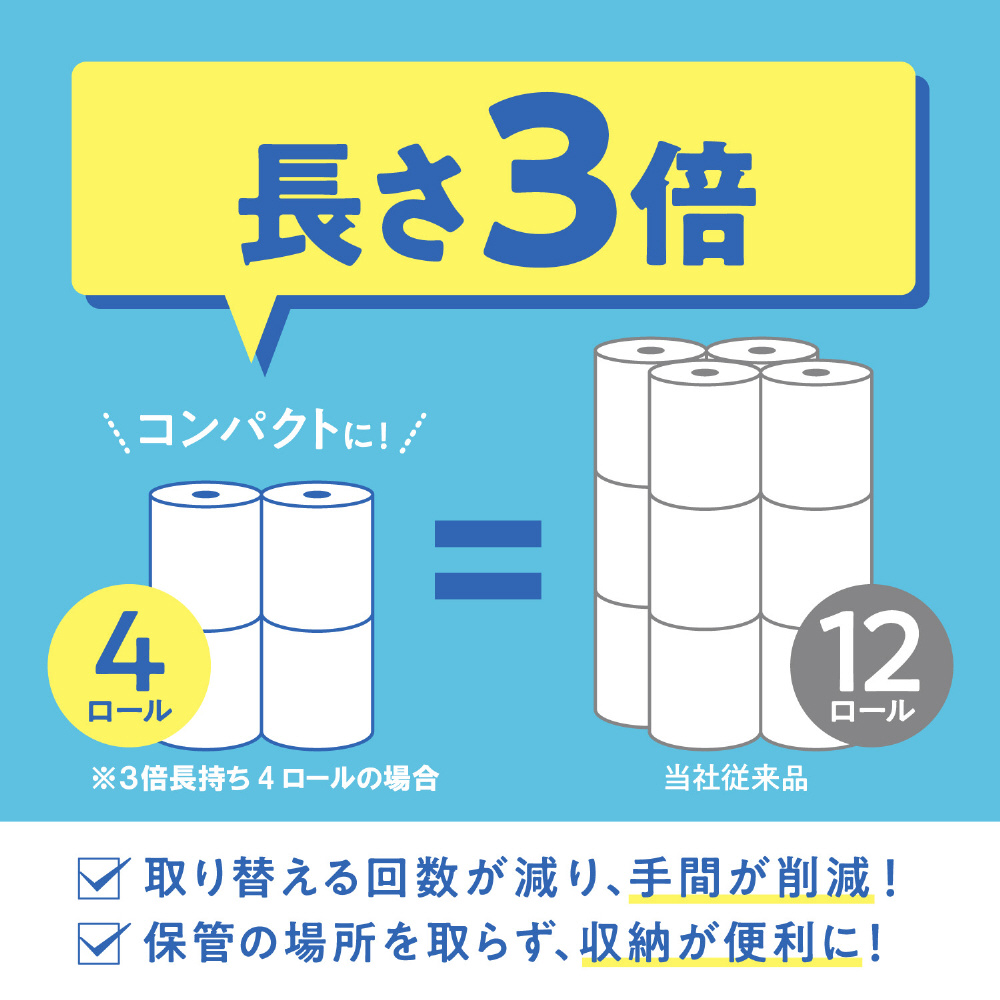 12ロールで36ロール分の長さ。省スペース化で保管もスッキリ。たっぷり使えて取り換えの手間を軽減