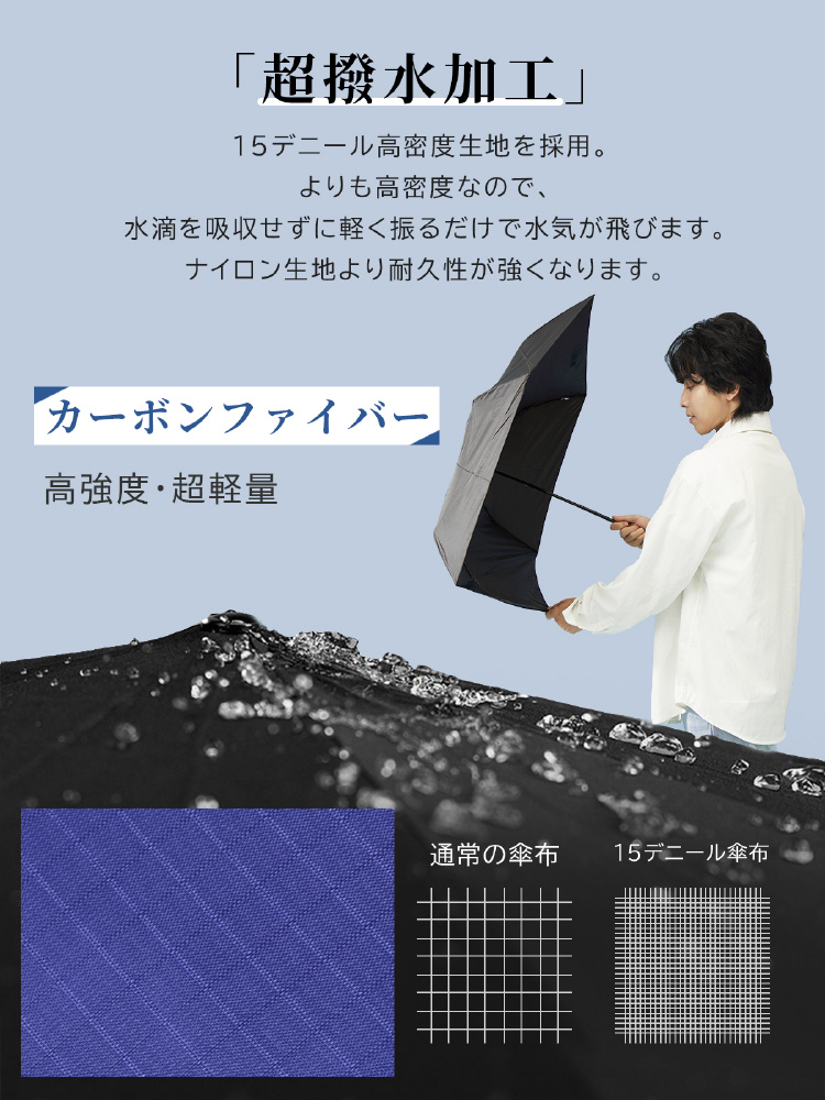15デニール生地を使い、細く強い糸で織り上げることにより、優れた撥水力を維持しながら薄く軽く改良することが出来ました。通常の生地より高密度なので、その表面は非常に細く、水滴を吸収することなく弾きます。そのため、水切れがとても良く、傘を差した後は軽く振っていただくだけで水気が飛び、カバンにも気楽にしまうことが可能。また、ポリエステル生地を使用しており、ナイロン生地より耐久性が強くなり、長くご利用できます。梅雨対策には欠かせない優秀なアイテムです!