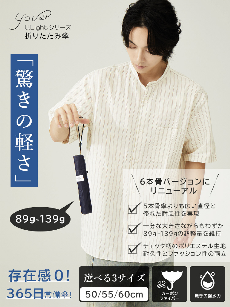 U.lightシリーズの超軽量折りたたみ傘に、新作『6本骨バージョン』が登場しました!従来の5本骨傘よりも大きな直径と優れた耐風性を実現。チェック柄を採用しており、シンプルで落ち着いた印象に仕上がります。ビジネスマンやサラリーマンにもぴったりです。