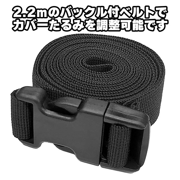 付属の2.2mのバックル式ベルトとヒモ絞りでカバーのバタつきを押さえます。