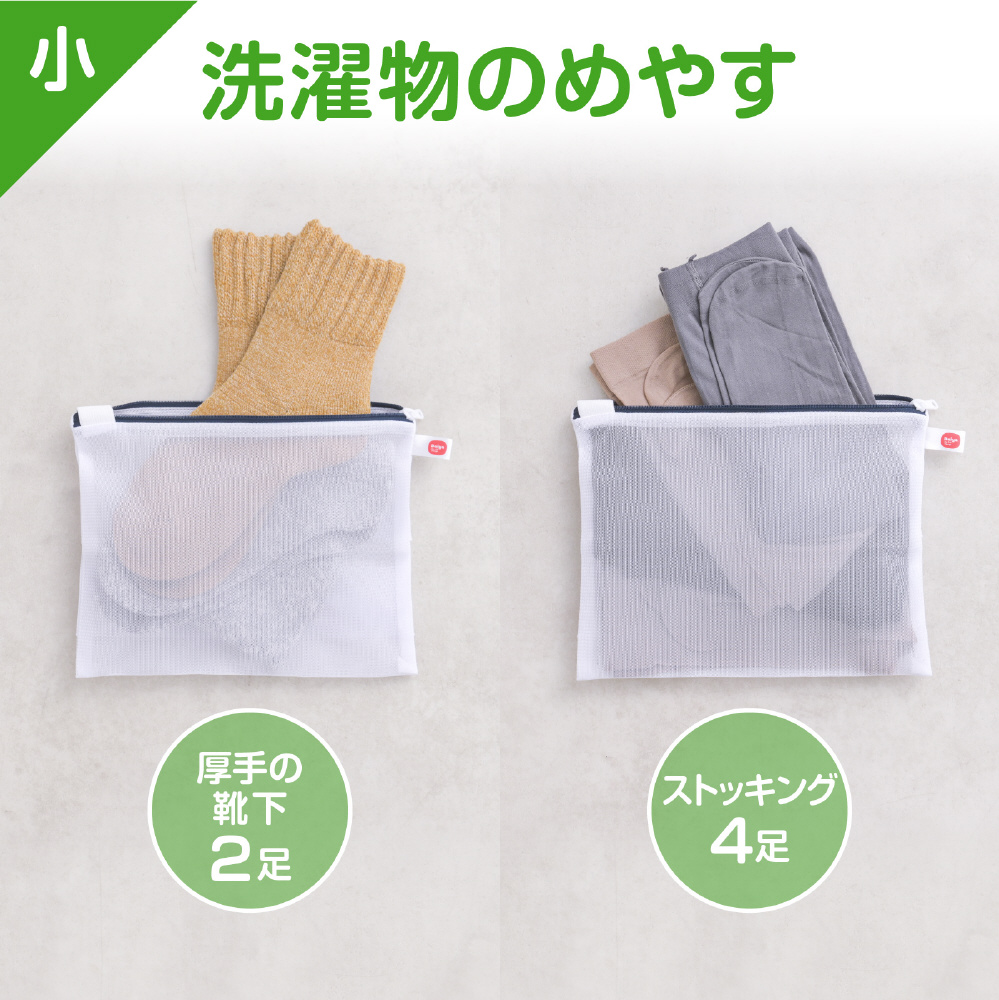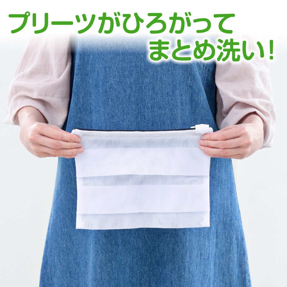 プリーツ部がひろがり、同等サイズの洗濯ネットより多くの洗濯物が入れられます。コンパクトに収納可能です。細かい網目のガードメッシュが洗濯物から出る糸クズなどの侵入をおさえ、ネット内の洗濯物をやさしく守ります。ファスナーカバーがついているので、他の洗濯物の傷みをおさえ、洗濯中にファスナーが開くことを防ぎます。