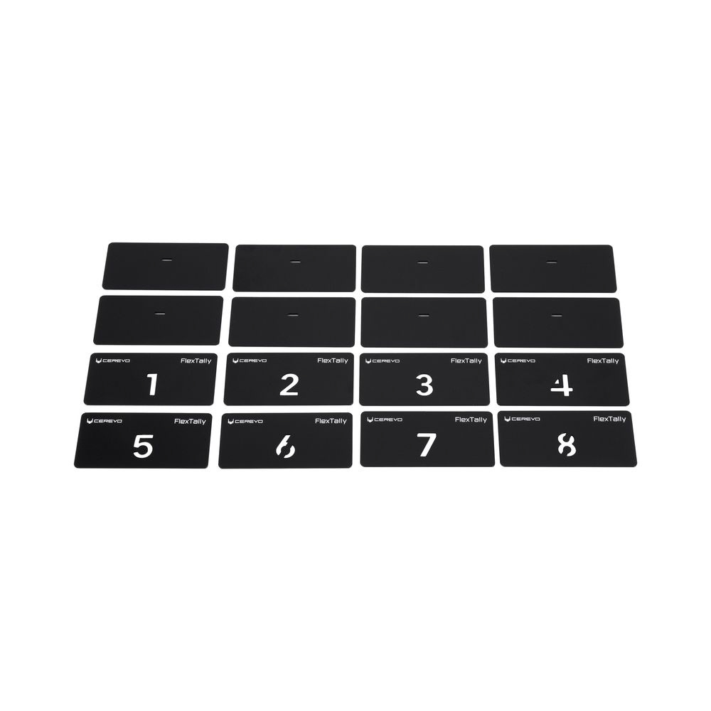 FlexTally本体には1-4のフロントカバーが標準で同梱していますが、こちらの単体販売では1-8までの8枚のフロントカバーと8枚のリアカバーのセットとなります。ランプを4個以上接続してご使用になる場合に、より便利になりました。