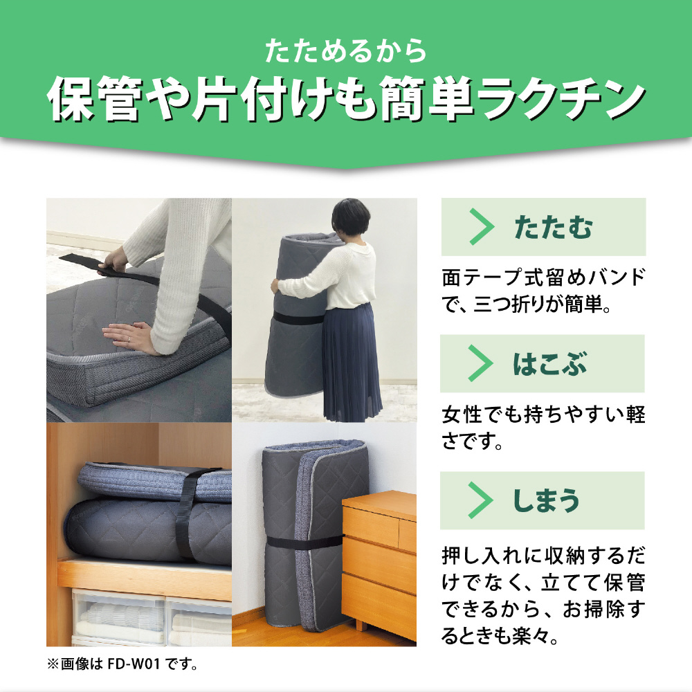 テープ式留めバンドで三つ折り可能。押し入れや、立てて収納可能でコンパクト!