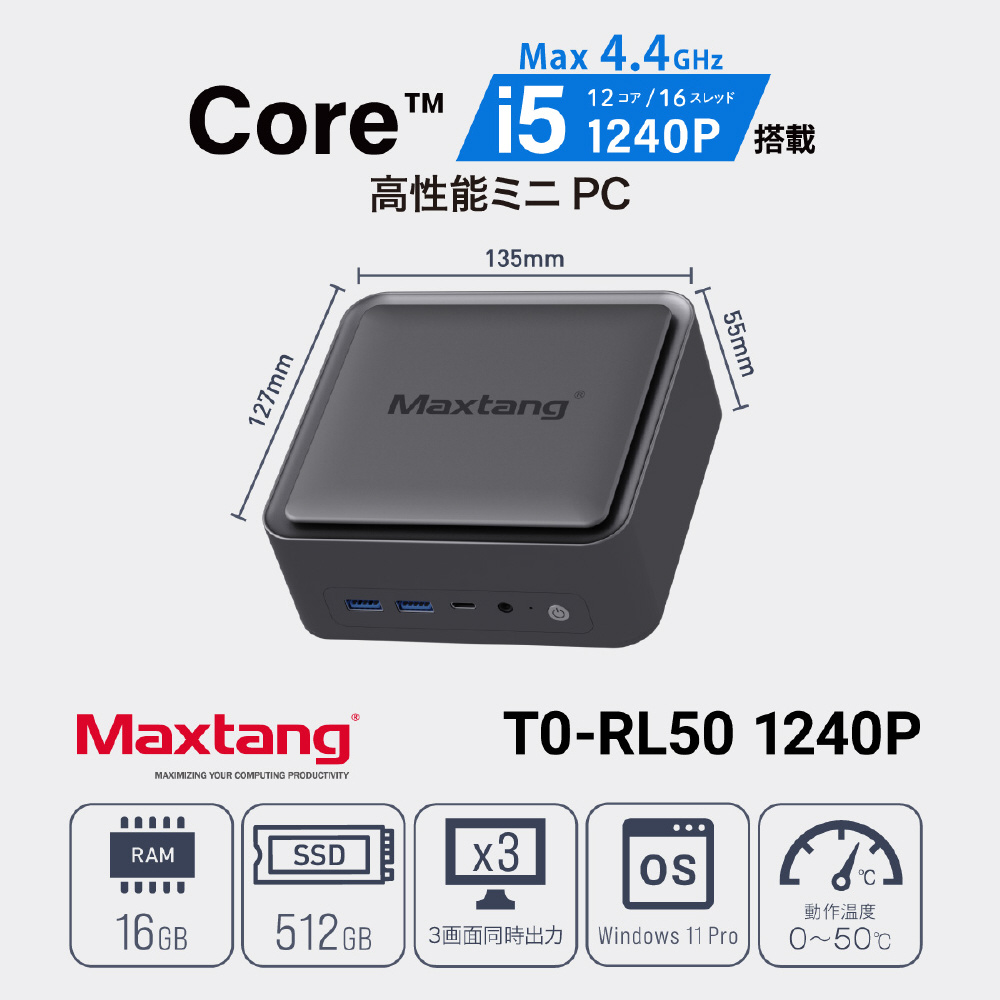 Maxtang T0-RL50 1240Pは、12コア/16スレッドの高性能CPU、Intel Core i5-1240Pを搭載したミニPCです。わずか135 mm四方の超小型筐体に最新規格のThunderbolt 4ポートやHDMI 2.0、DisplayPort 1.4、多数のUSBポートを搭載し、最大で3画面の同時出力に対応します。