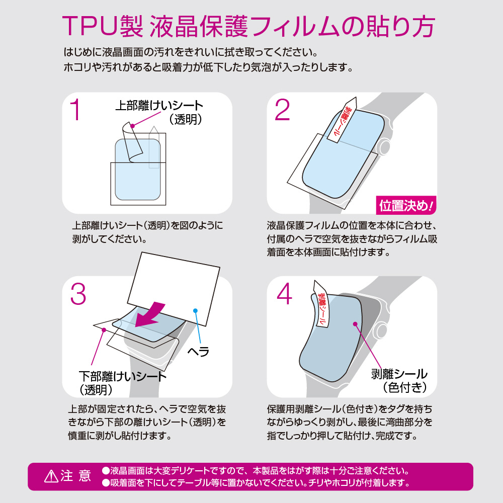 フィルムを貼った後、特殊シリコン層吸着部が時間経過とともに気泡を分散し目立たなくなります。
