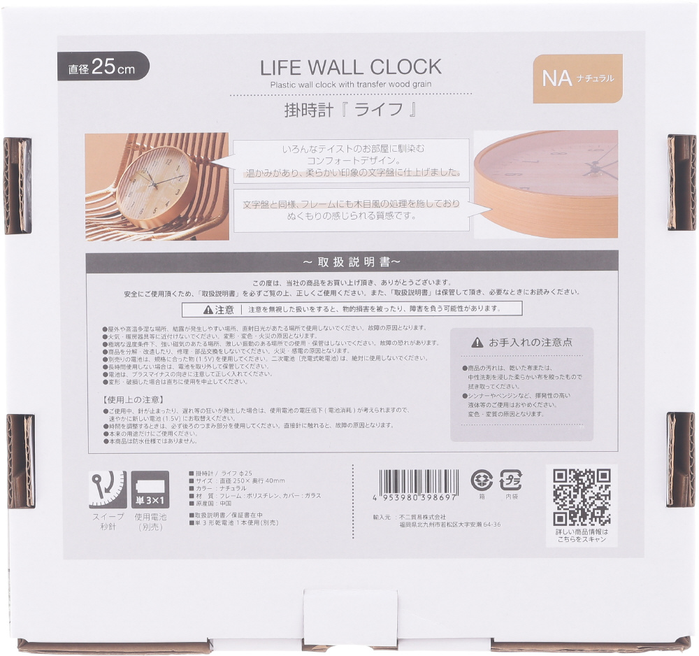 掛時計 ライフ 25cm ナチュラル 39869