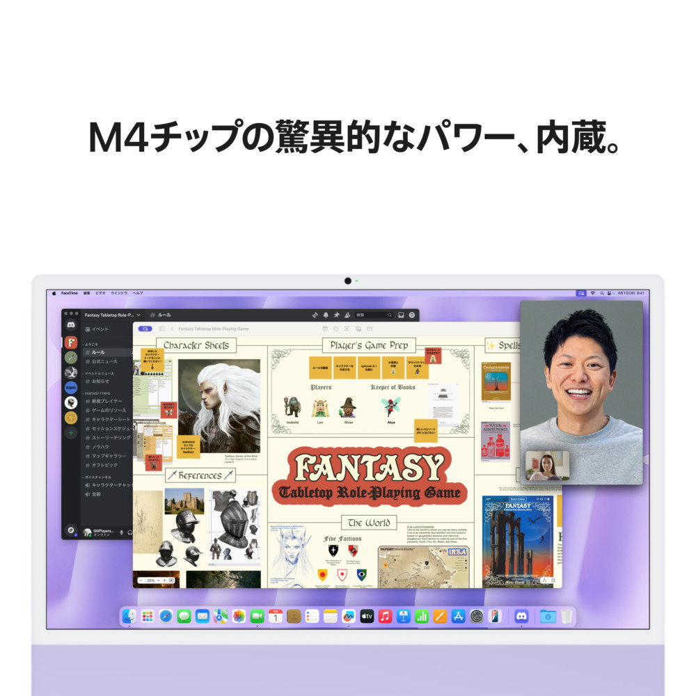 iMacがM4チップを搭載。パフォーマンスとAI機能が飛躍的に向上しました。より高速になったCPUはあらゆる作業を一段とスピードアップ。ハードウェアアクセラレーテッドレイトレーシングを採用した先進的なGPUは、目を疑うほどリアルなグラフィックスをもたらします。メディアエンジンは、複数の4Kビデオストリームをスムーズに編集できるように強化されました。より高速になった最大32GBのユニファイドメモリは、なめらかな動きのゲームプレイやアプリ間でのシームレスなマルチタスクを実現。AppleのパワフルなNeutral Engineは、写真の自動補正やビデオの背景ノイズ除去など、AIのタスクをサポートします。
