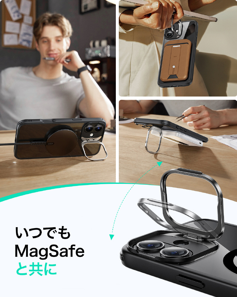 折りたたんだときにカメラのフレームに隠れるように配置され、MagSafeリングを100%妨げず、いつでもどこでも自由に調整でき、安定した角度で動画を視聴できます。