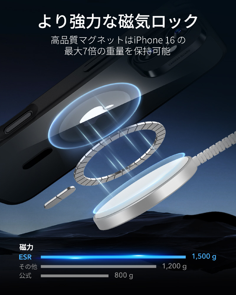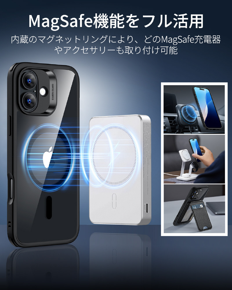 1,500gの保持力を持つ強力な内蔵マグネットは、より速く、より簡単な瞬間吸着ワイヤレス充電を可能にし、あらゆるMagSafeアクセサリーに安全なロックを提供します。