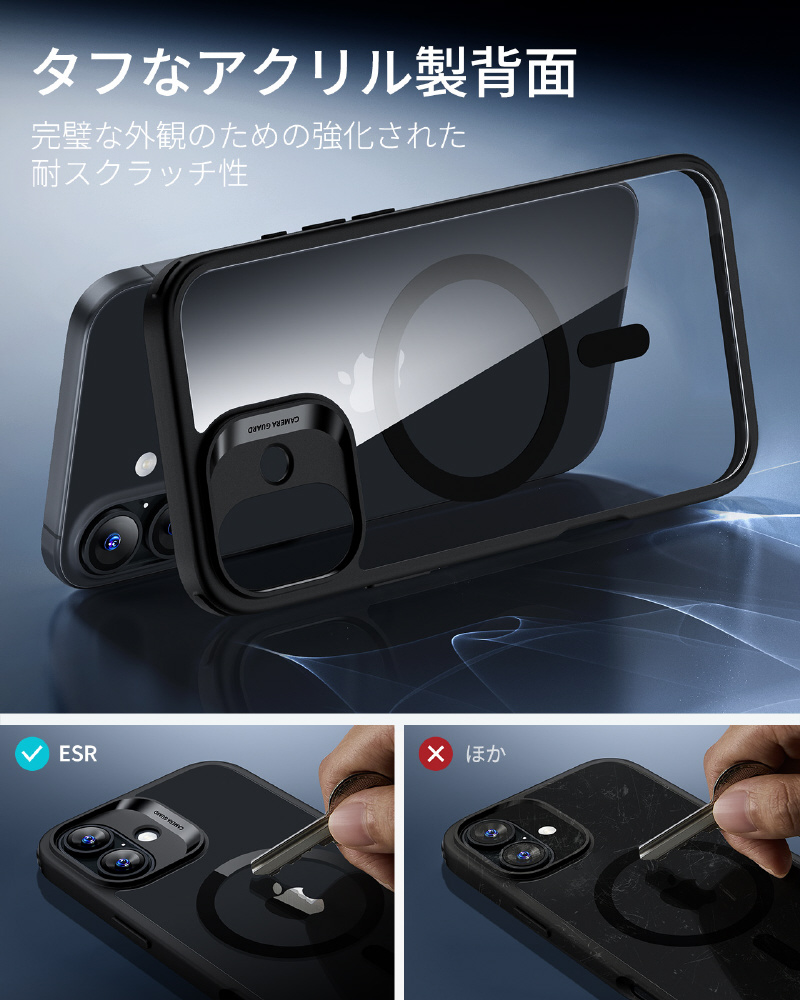 傷がつきにくく、透明度の高いアクリル製の背面により、iPhone 16のオリジナルで洗練された本来の外観をキープします。