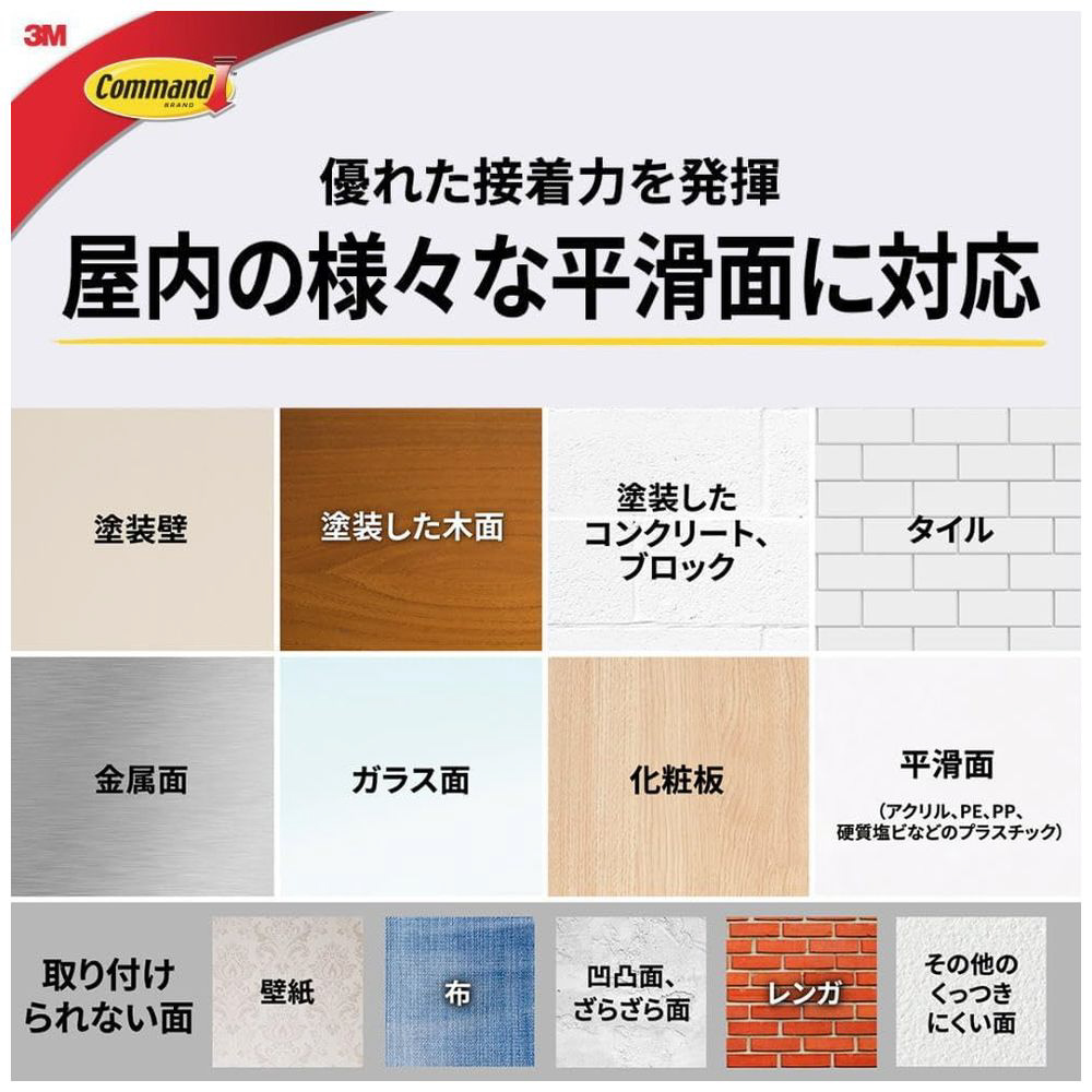 ■簡単にはがせ、多くの材質の壁面(平滑面)に対応します。(壁紙や凹凸面には使用できません。)