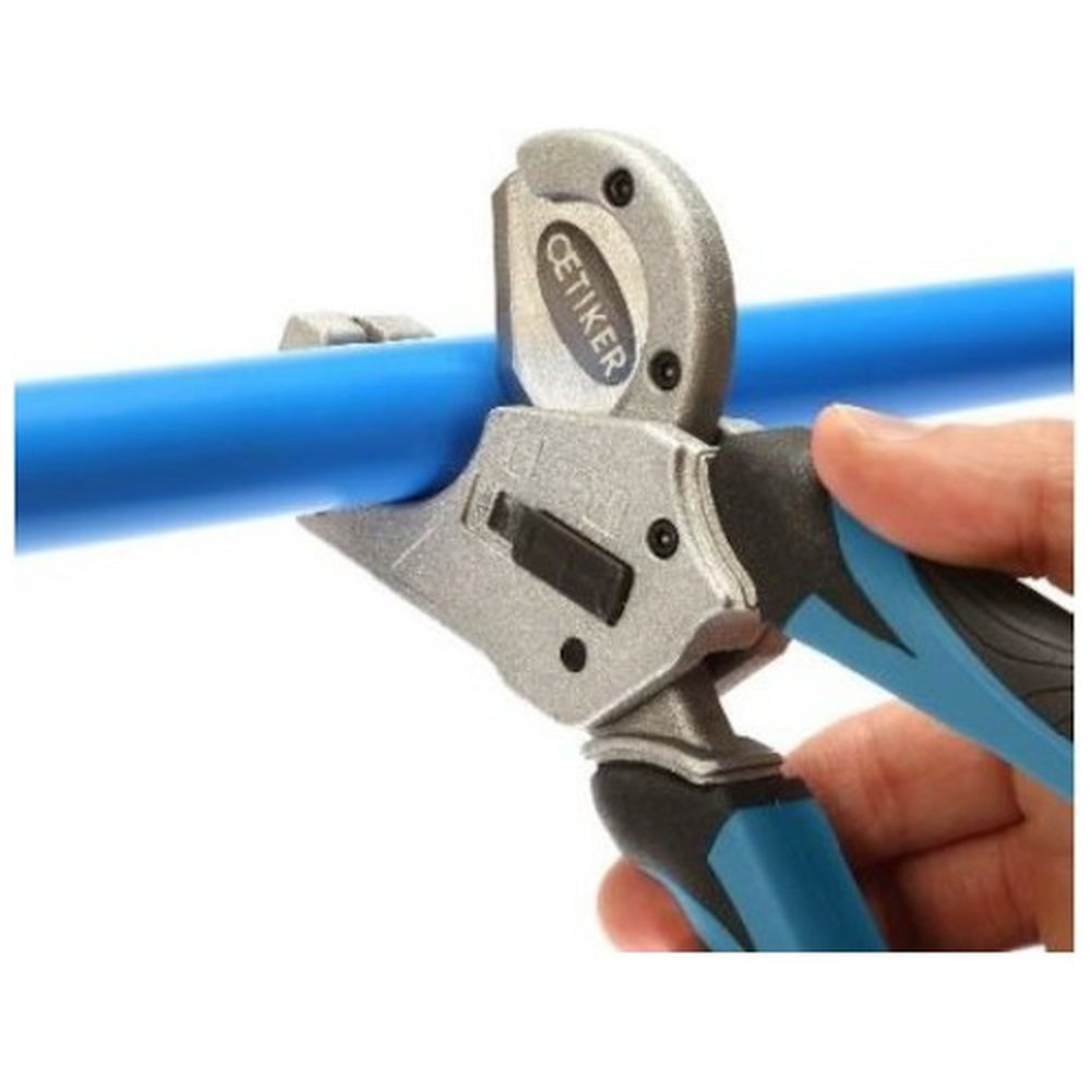 片手で簡単に操作できる樹脂管用チューブカッター。安全設計で、交換可能な刃を使用。
