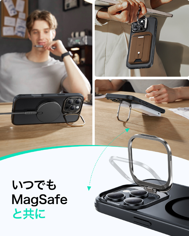 折りたたんだときにカメラのフレームに隠れるように配置され、MagSafeリングを100%妨げず、いつでもどこでも自由に調整でき、安定した角度で動画を視聴できます。