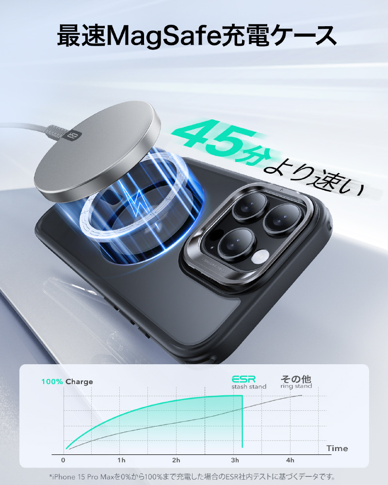 1,500 gの吸着力を持つ強力な内蔵磁石により、素早く簡単にワンタッチでワイヤレス充電が可能で、MagSafeアクセサリーを確実に吸着します。