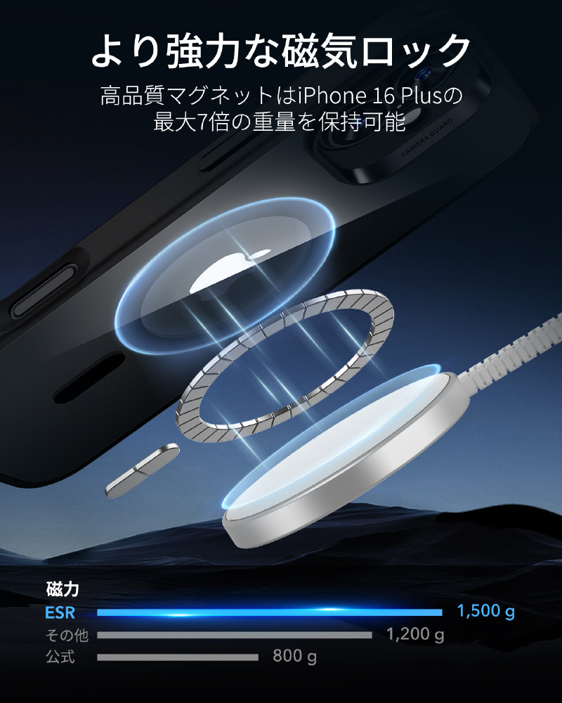 1,500gの保持力を持つ強力な内蔵マグネットは、より速く、より簡単な瞬間吸着ワイヤレス充電を可能にし、あらゆるMagSafeアクセサリーに安全なロックを提供します。