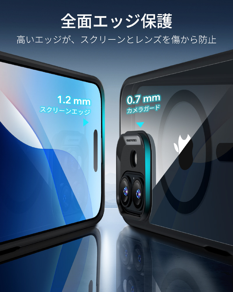 盛り上がったスクリーンエッジとカメラガードレンズフレームが傷からの保護を強化します。