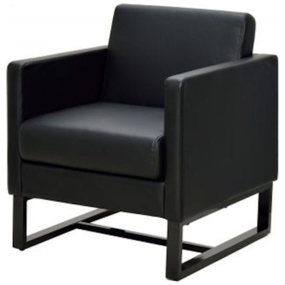 応接室や待合空間、リビングに適したスクエアソファ1人掛け。汚れてもお手入れしやすい合成皮革張り、オールブラックでスタイリッシュな空間を演出します。
