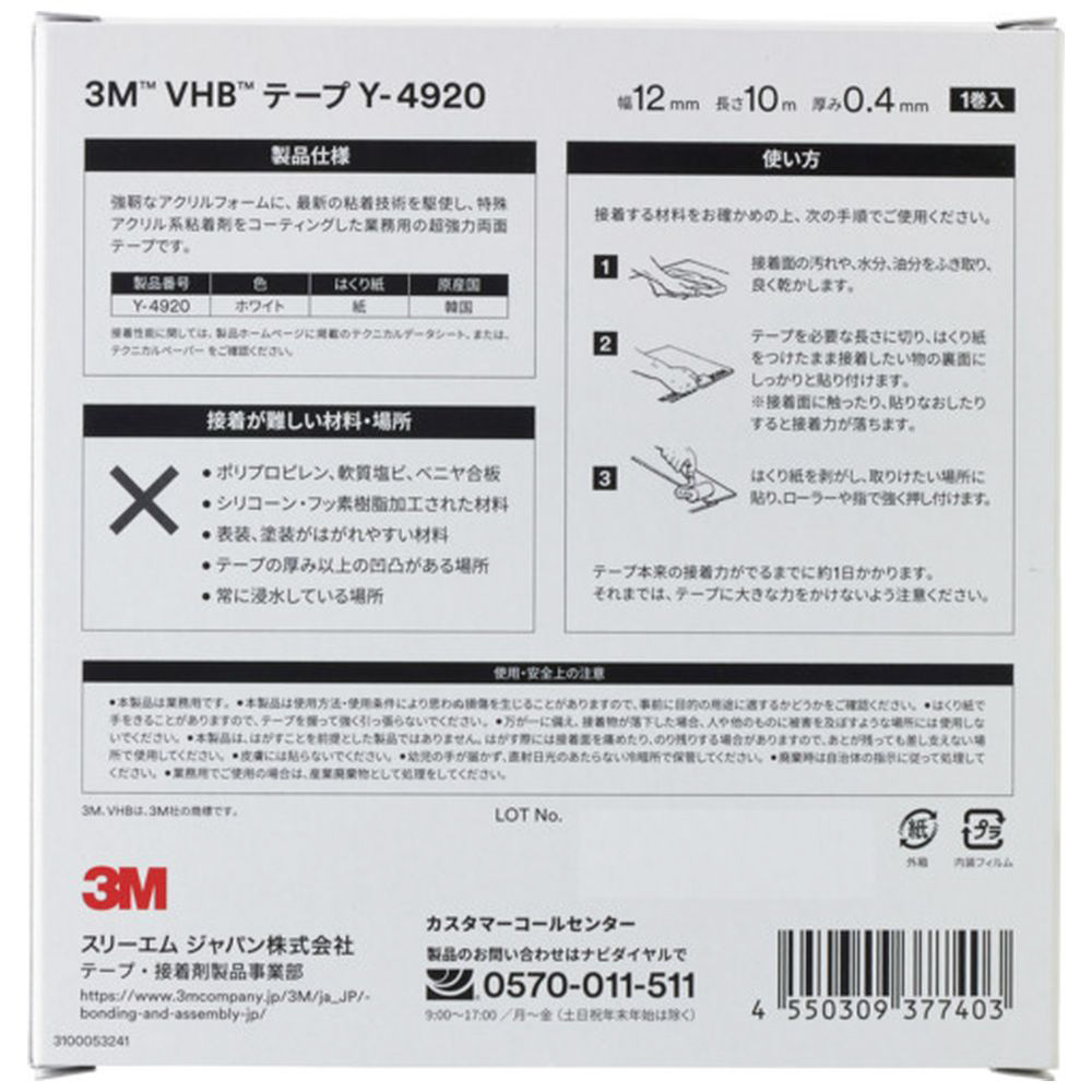 3M VHBテープ Y-4920 12mmX10m 薄手タイプ