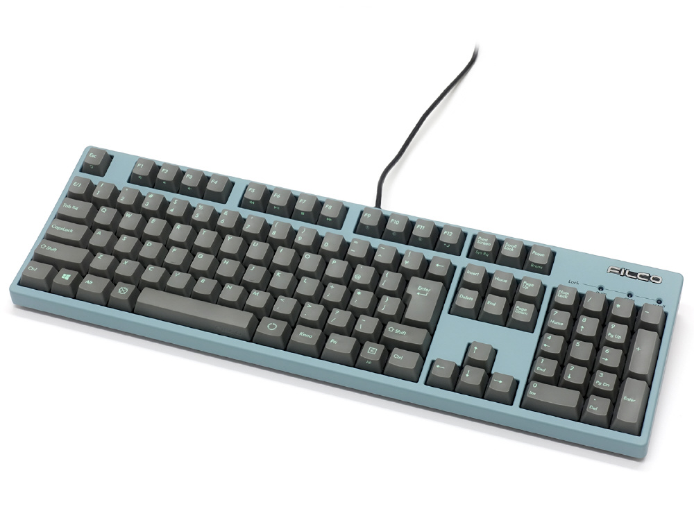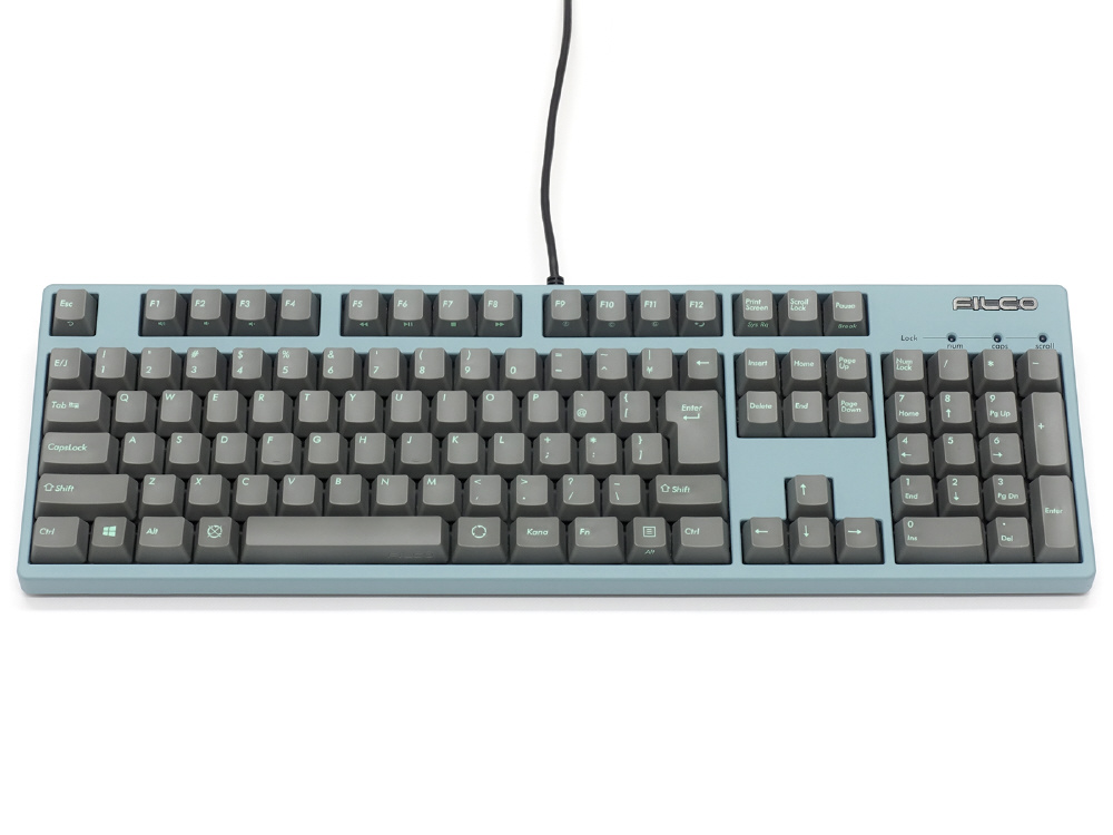 浅葱色のフレームにスカイグレー地のキーキャップを搭載したキーボード。
