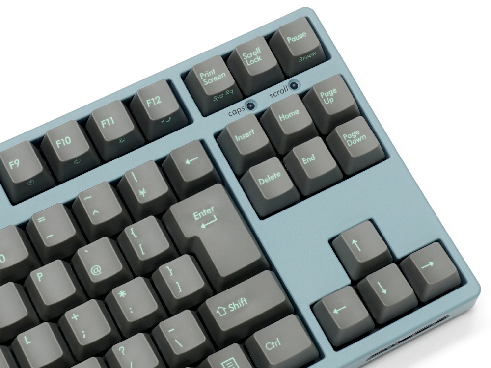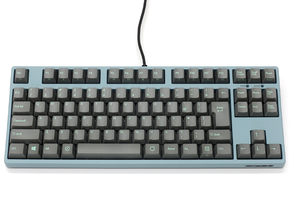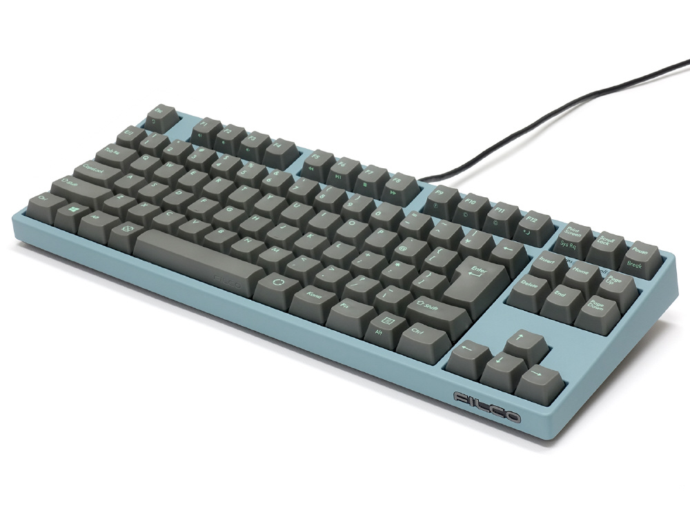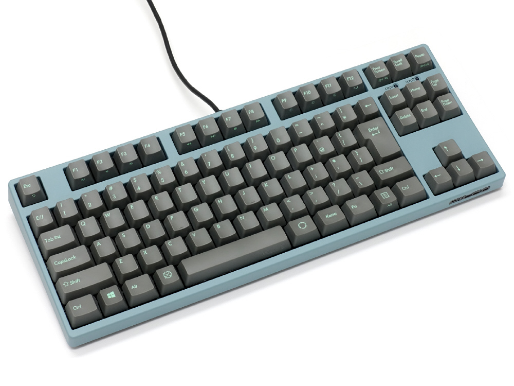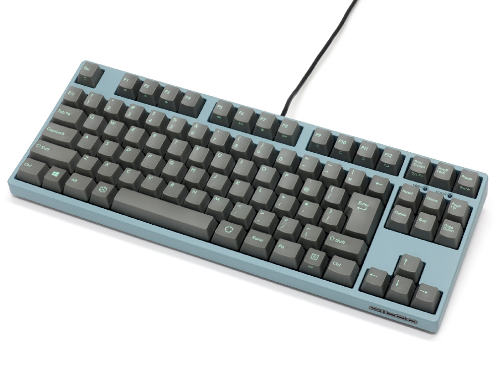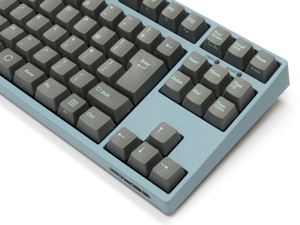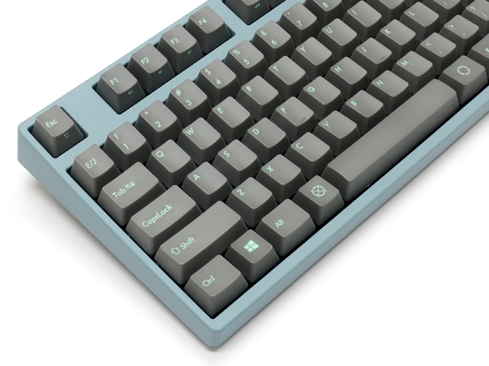 浅葱色のフレームにスカイグレー地のキーキャップを搭載したキーボード。