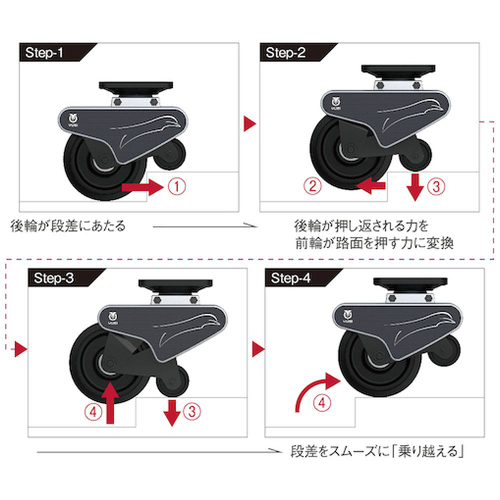 業界初の段差を乗り越えるキャスターです。