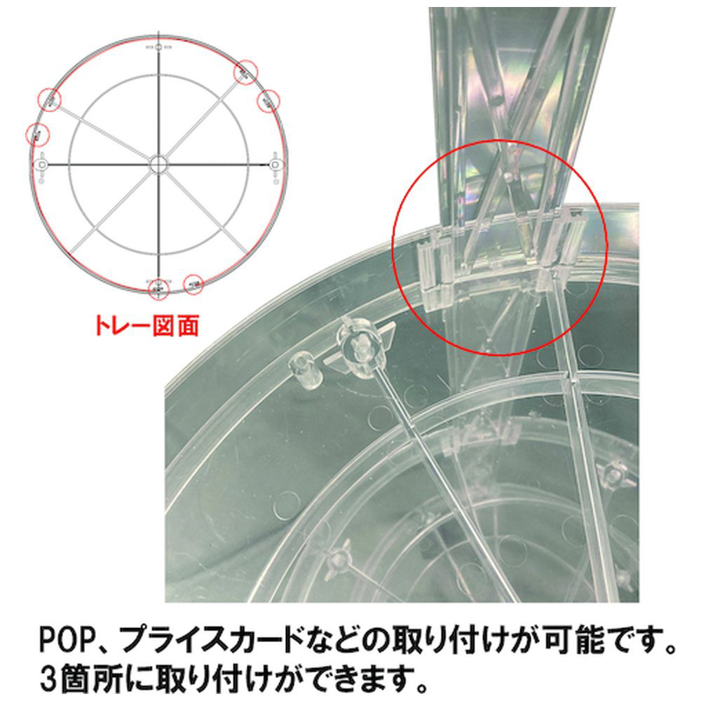 正方形なので商品を360度アピールでき、ラック部分にはPOPやプライスカードを取り付けられる差し込み口があります。