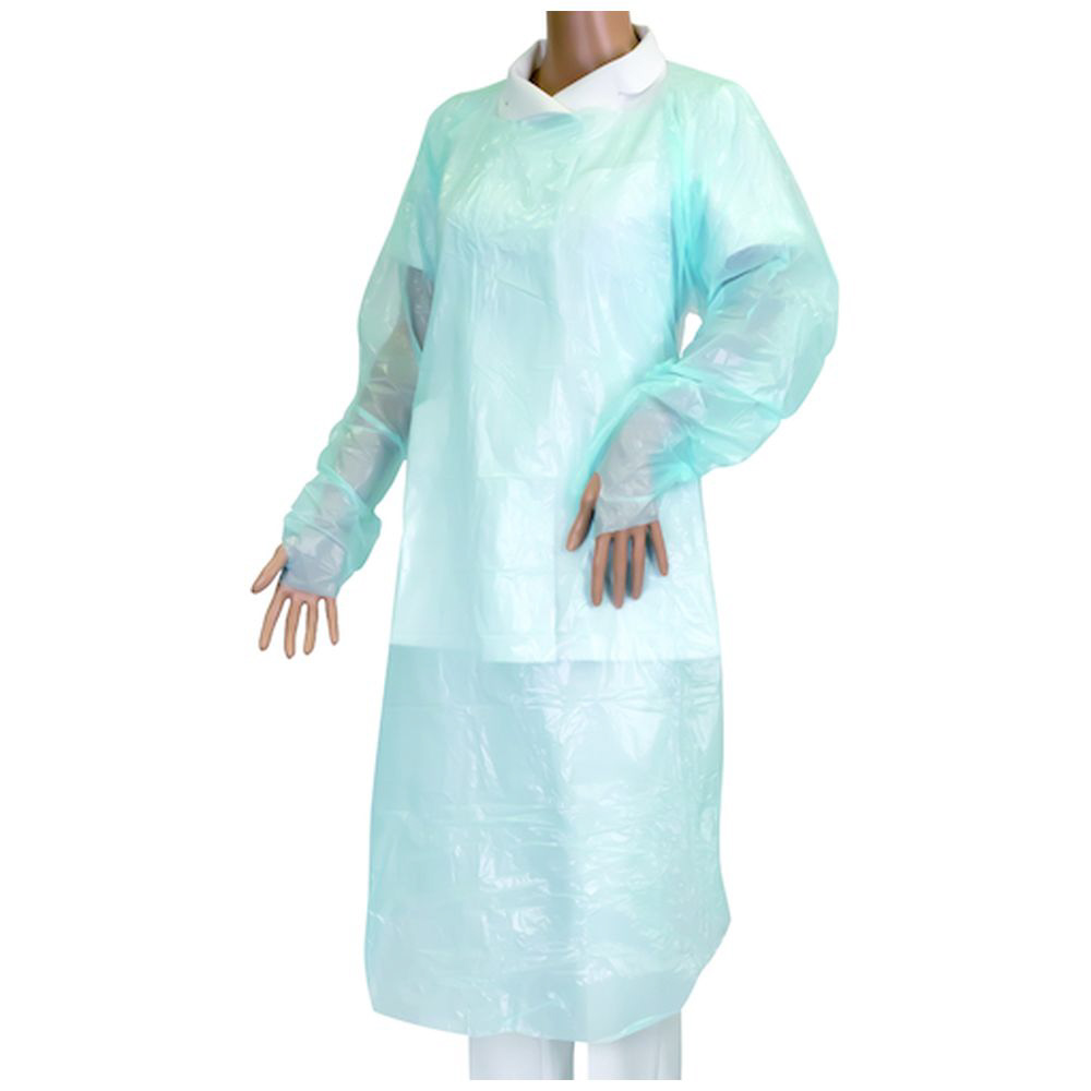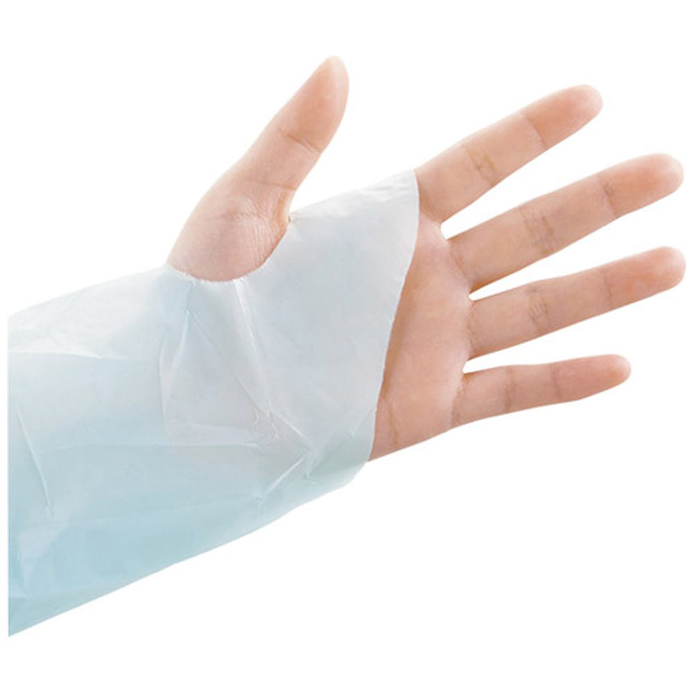 防水・長袖の使い捨てプラスチックエプロン。医療現場から清掃、食品加工まで幅広く対応。フィンガーフック付きで着脱簡単。