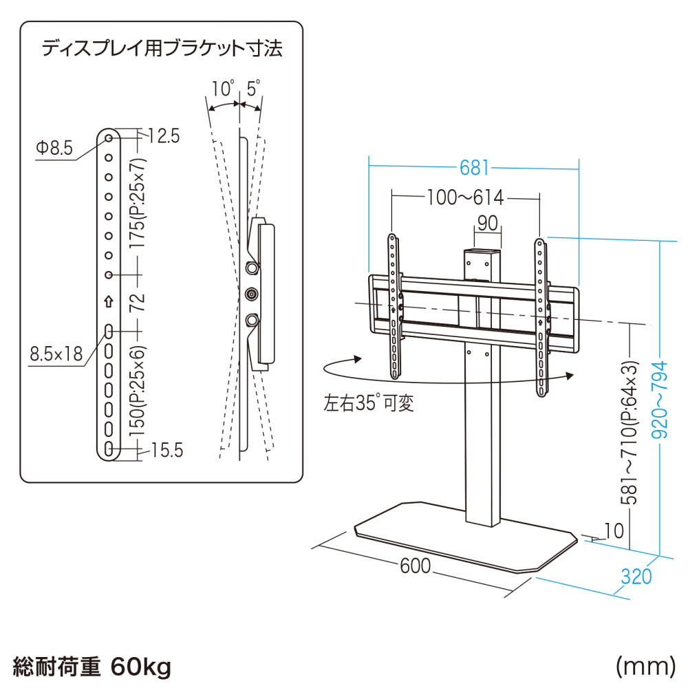 ●42〜75型までのディスプレイに対応しています。(ディスプレイ耐荷重40kg)