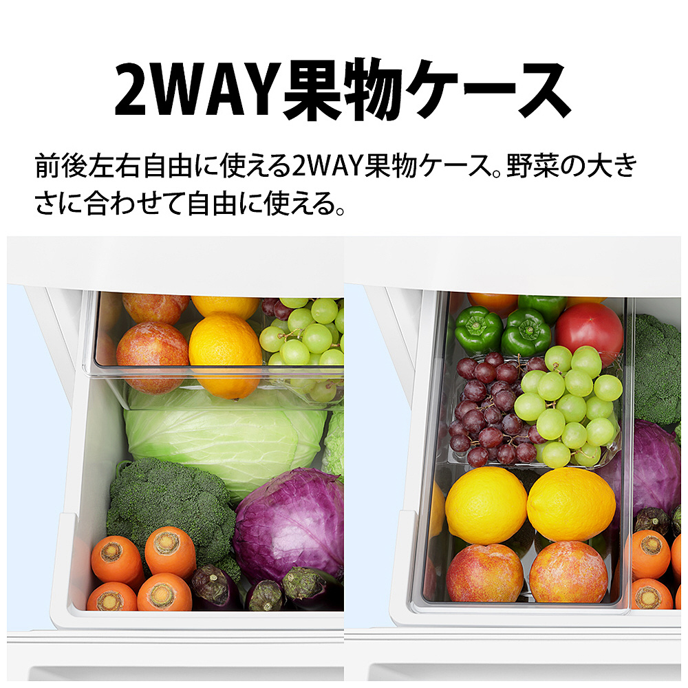 スリム幅&真ん中レイアウト野菜室。前後左右に設置できる果物ケース搭載。