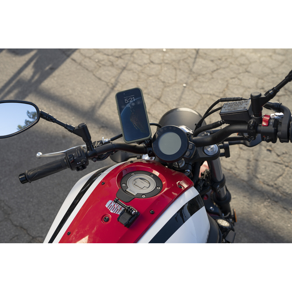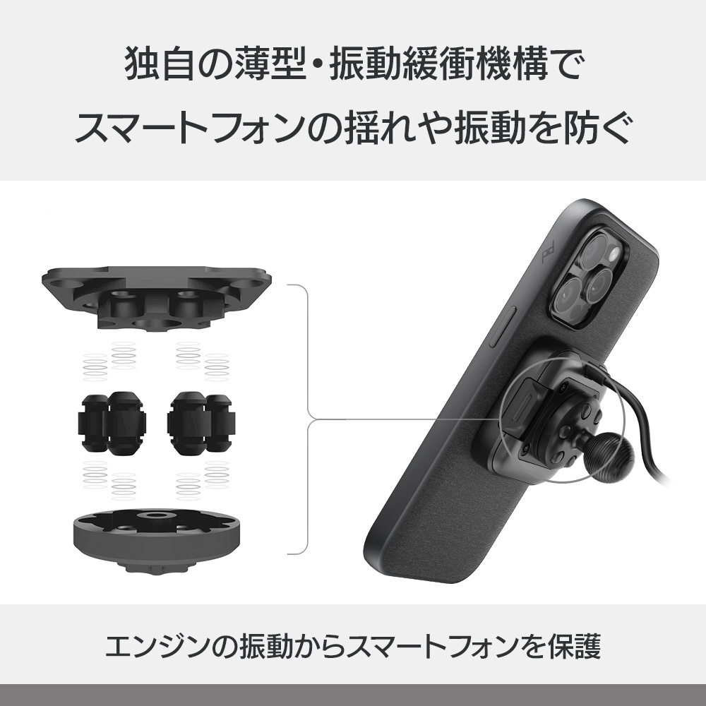 モーターバイク用マウント専用に、独自の振動緩衝機構を開発。緻密に設計された技術により、薄型でかさばらない形状ながらも効果的にスマートフォンの揺れや振動を防止し、エンジンの振動からスマートフォンを保護します。