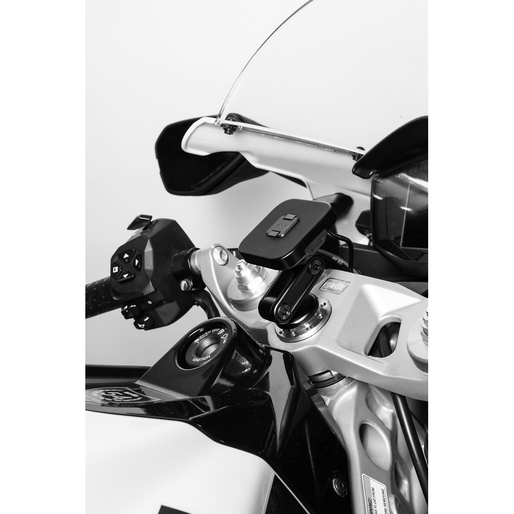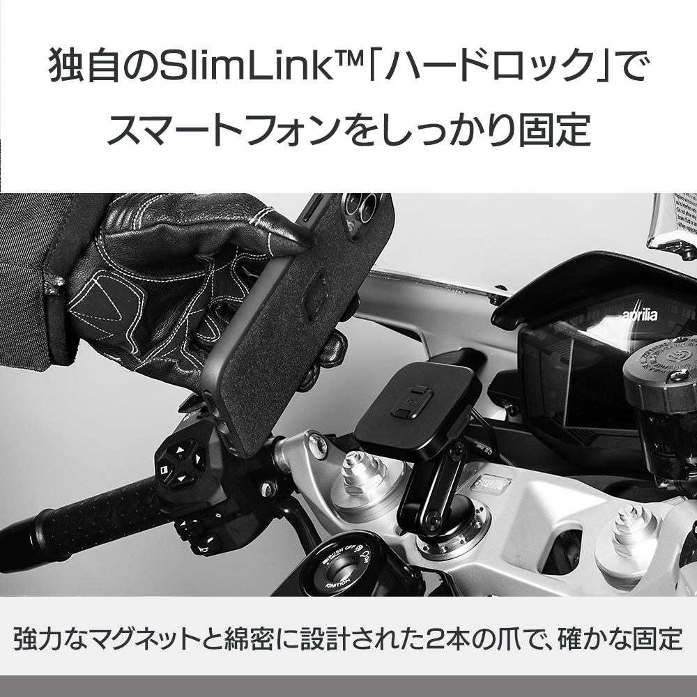 本体は耐水性に優れた頑丈なアルミ製で、ヘッド部分の独自機構によりスマートフォンの揺れや振動を防止します。SlimLink?のハードロックによりしっかりとスマートフォンを固定し、取り外す際にはヘッド部分のプッシュボタンで簡単にロックを解除できます。バイク用グローブを装着した状態でも、スマートフォンの着脱が可能です。